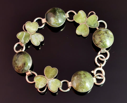 Antique Silver Shamrock bracelet, clover, Connemara marble, c1900s