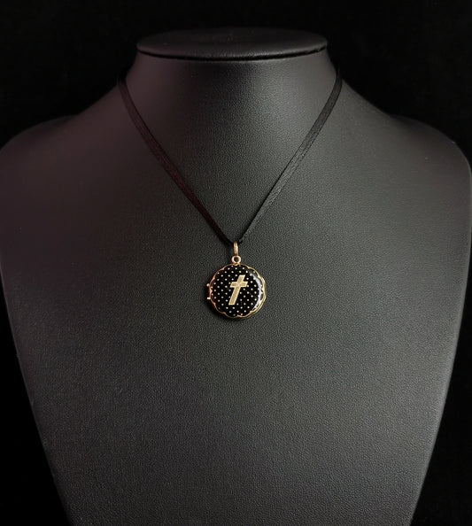 Antique Victorian mourning locket, black enamel, Cross, 9ct gold