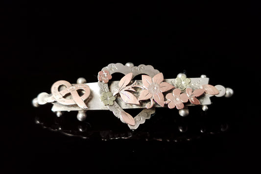 Antique Silver Sweetheart brooch, 9ct gold, Heart, Knot and Flowers