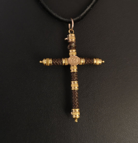 Antique Georgian mourning Cross pendant, hairwork, 9ct gold