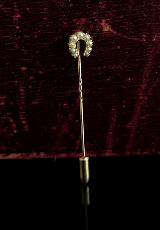 Antique horseshoe stick pin, 9ct gold, seed pearl