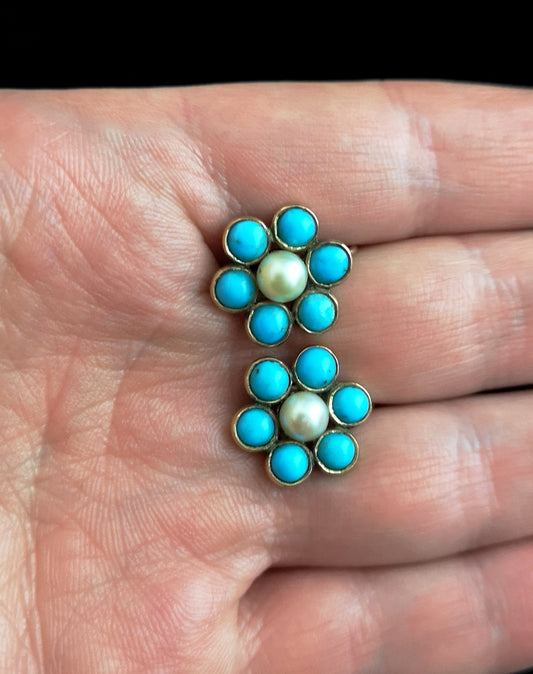 Antique flower earrings, turquoise and pearl, 9ct gold