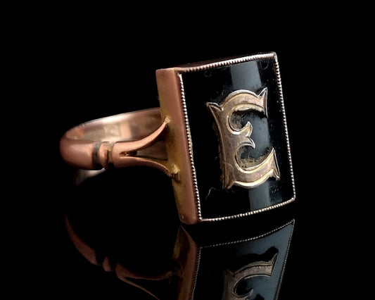 Victorian Onyx mourning ring, 9ct Rose gold, Letter E