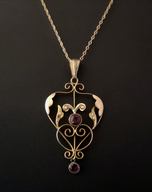 Antique Art Nouveau lavalier pendant, Amethyst, 9ct gold