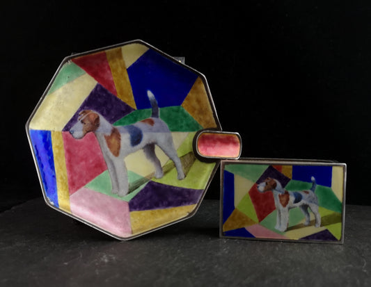 Art Deco Silver and enamel smokers set, Ashtray, Fox Terrier
