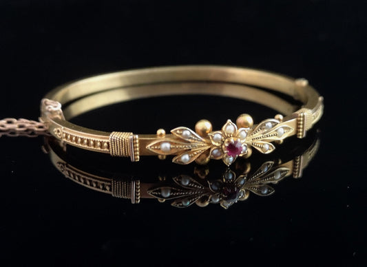 AusverkauftVictorian 15ct gold bangle, Pearl and Ruby