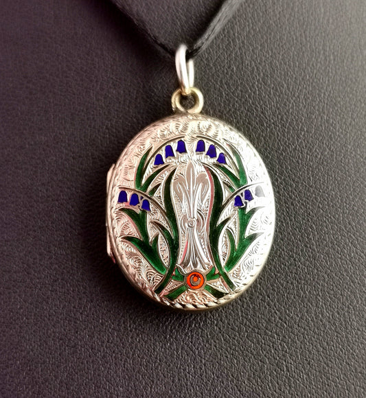 Antique enamelled Bluebells locket, 9ct gold back and front, Victorian