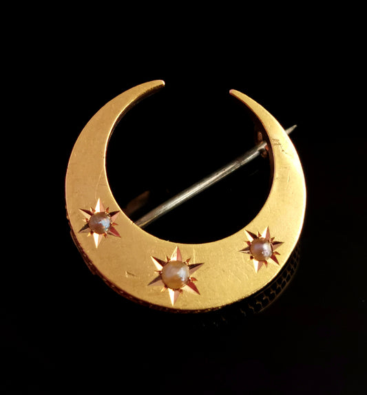 Antique Victorian Crescent moon brooch, 15ct gold, split pearl