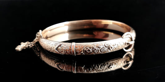 Antique 9ct Rose gold buckle bangle, Ivy leaf engraved, Edwardian