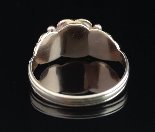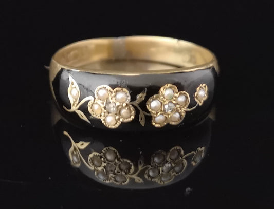 Victorian 15ct gold mourning ring, black enamel, diamond and pearl