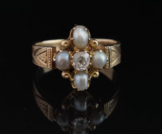Sold on layaway - Victorian diamond and pearl navette ring, 15ct gold