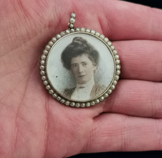 Victorian portrait miniature pendant locket, 9ct gold, seed pearl