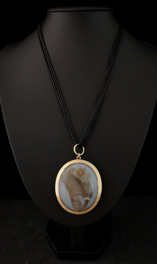 Georgian gold mourning locket, portrait pendant, hairwork, 15ct