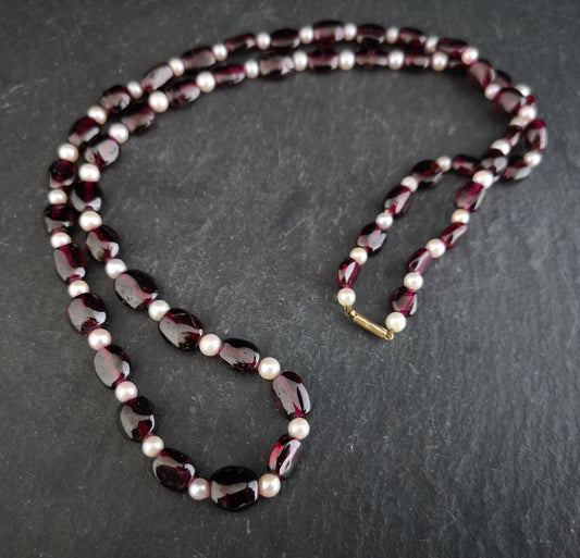 Vintage garnet and cultured pearl necklace, 9ct gold clasp