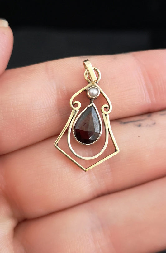 Antique Art Nouveau garnet and seed pearl pendant, 9ct