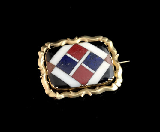 Antique gold Pietra Dura brooch, Victorian, agate, sunstone, lapis lazuli