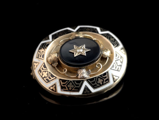 Antique mourning brooch, Victorian gold, enamel and pearl brooch