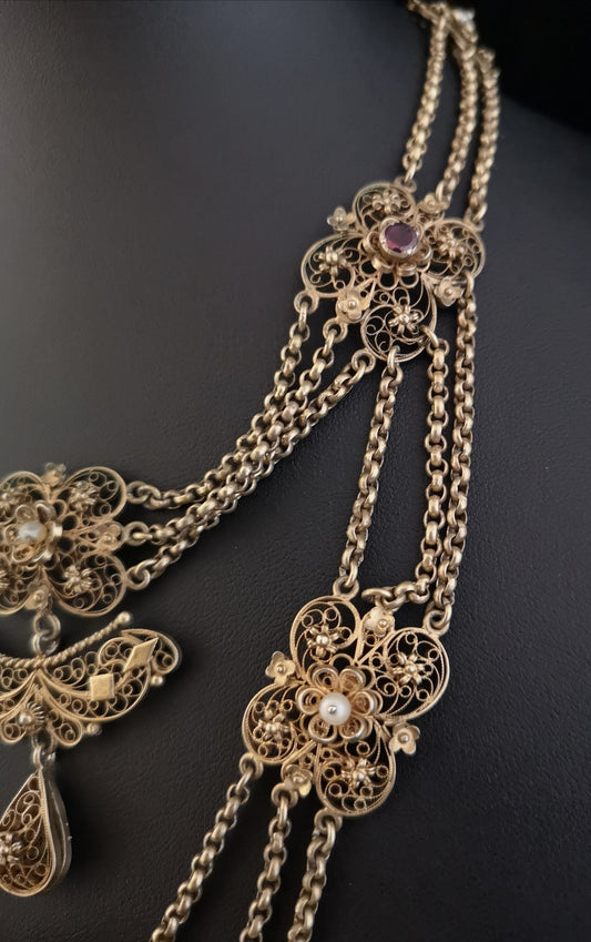 Antique French festoon necklace, garnet and pearl, silver gilt, 19th century