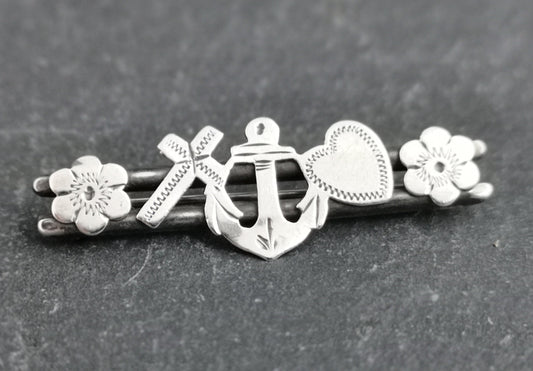Antique faith, hope and charity brooch, Edwardian sterling silver