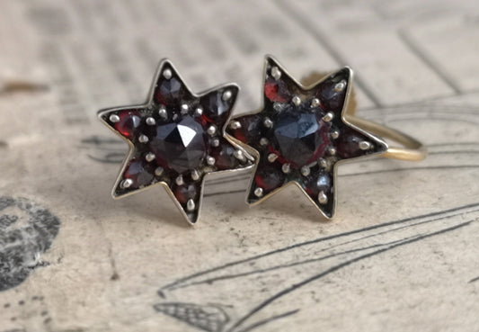 Antique Victorian bohemian garnet earrings, star, 9ct gold screw back