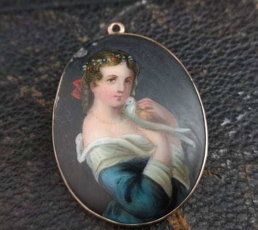 Antique gold portrait brooch, maiden and dove, Pendant