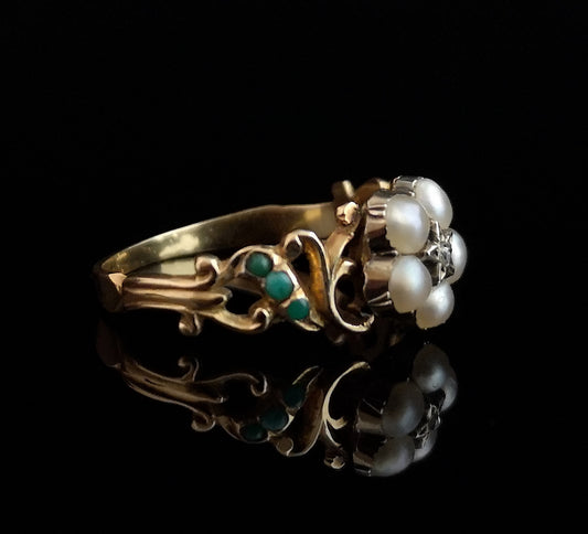 Victorian turquoise, diamond and pearl ring, 18ct, forget me not flower