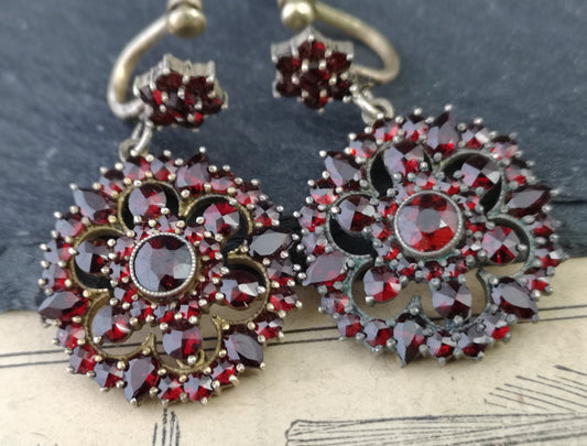 Antique Victorian bohemian garnet earrings, forget me not, dangly earrings