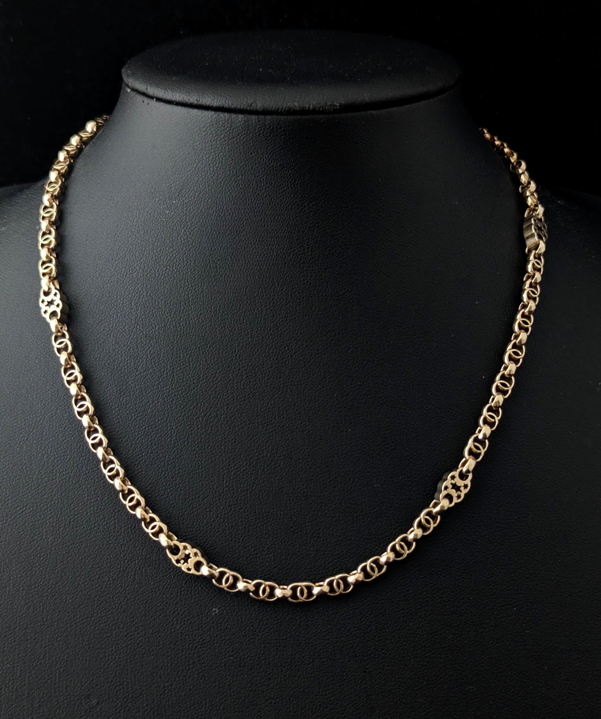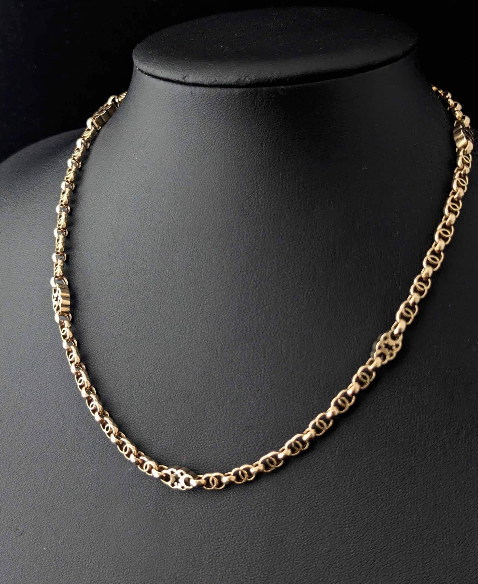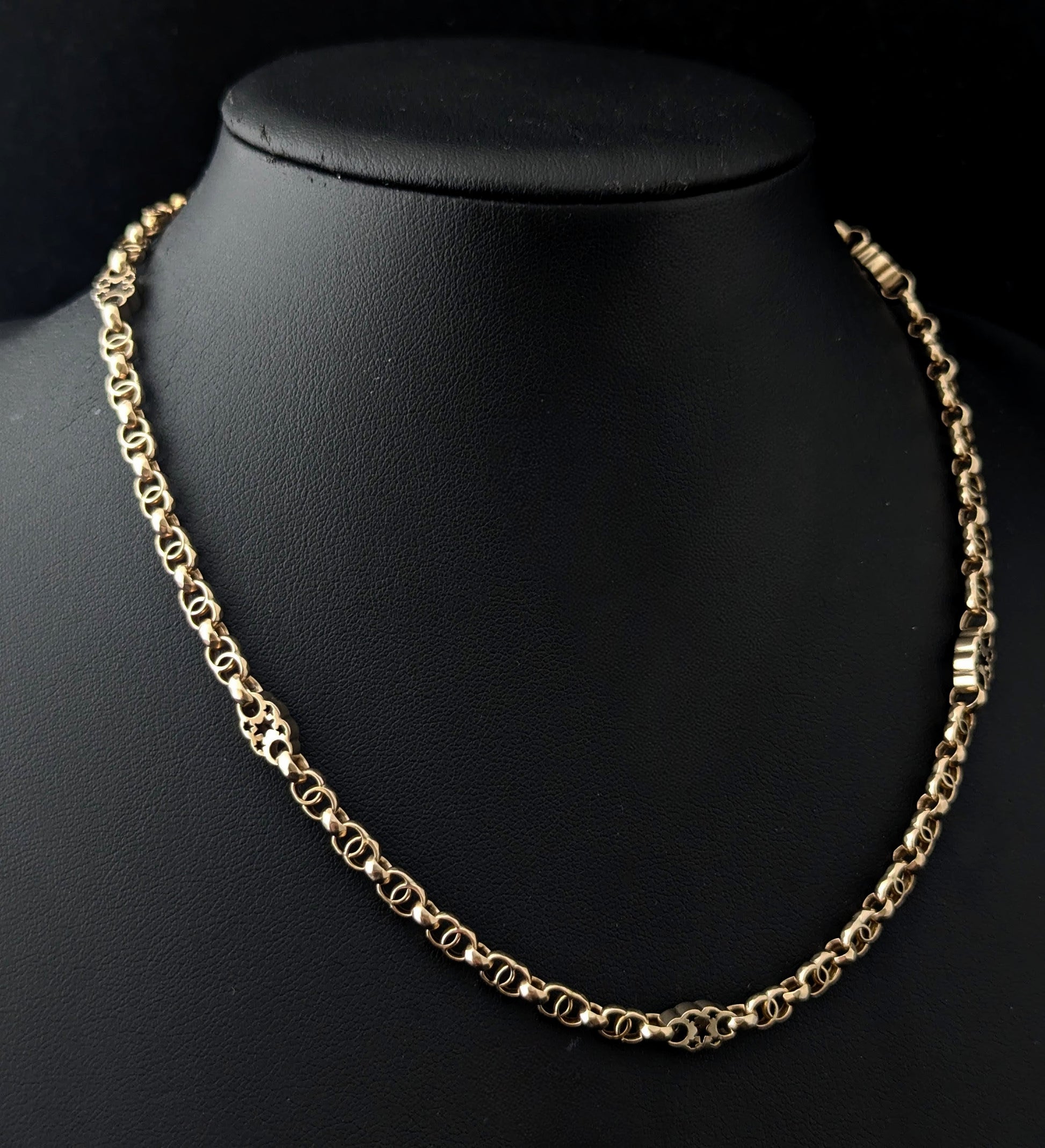 A stunning chain made up of antique fancy links which have wonderful celestial Star punched spacer links and double interlinking sections and a smaller section of antique Rolo link.