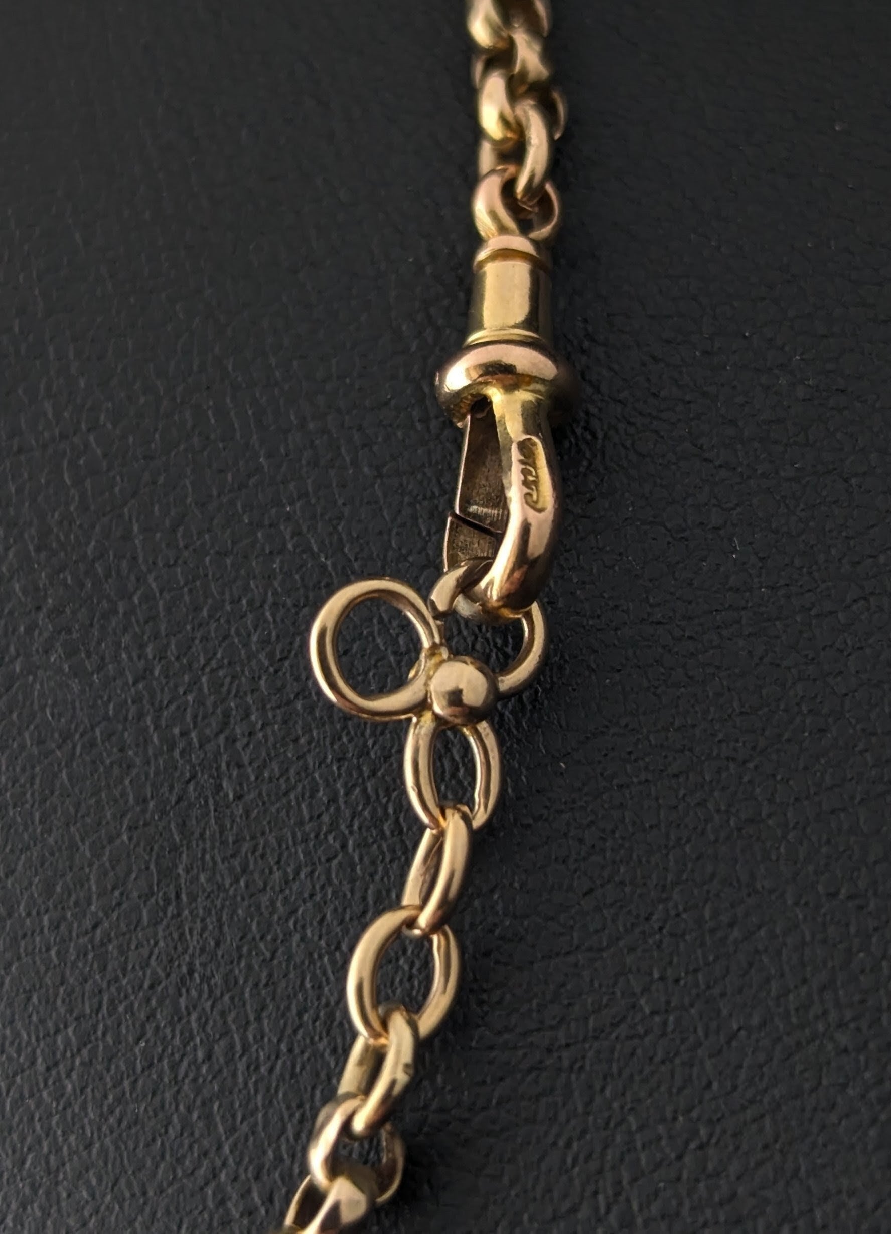 Good used condition overall, some surface wear commensurate with age, a few links with small dings or slightly out of shape, made up of two different chain lengths with a slight difference in gold tones, dog clip a later replacement