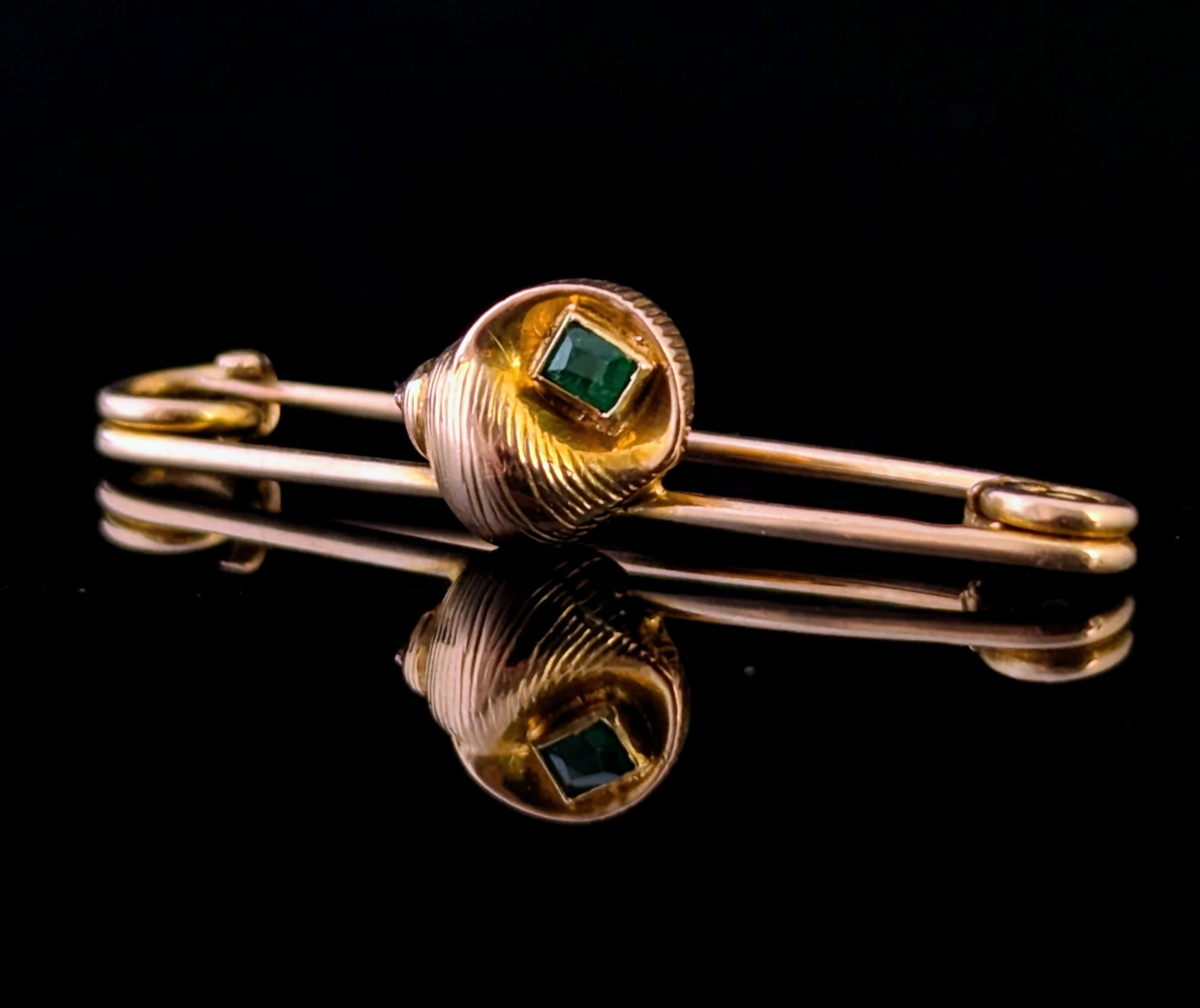 The rich yellow gold bar has a smooth finish and a sleek look, the centre features a lovely shell design with the centre set with a rich vibrant emerald.