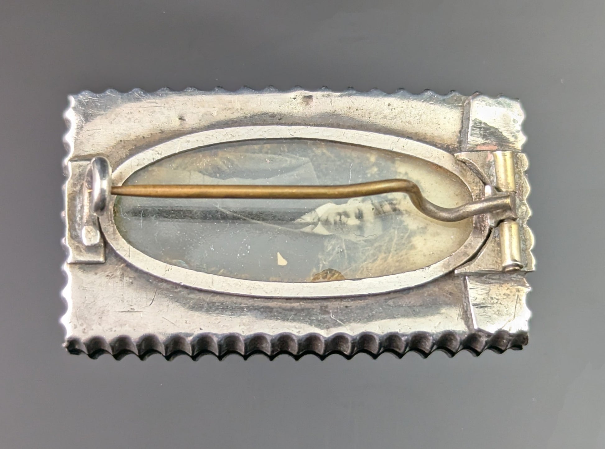 Antique Aesthetic locket brooch, Owl and Swallow, Sterling silver