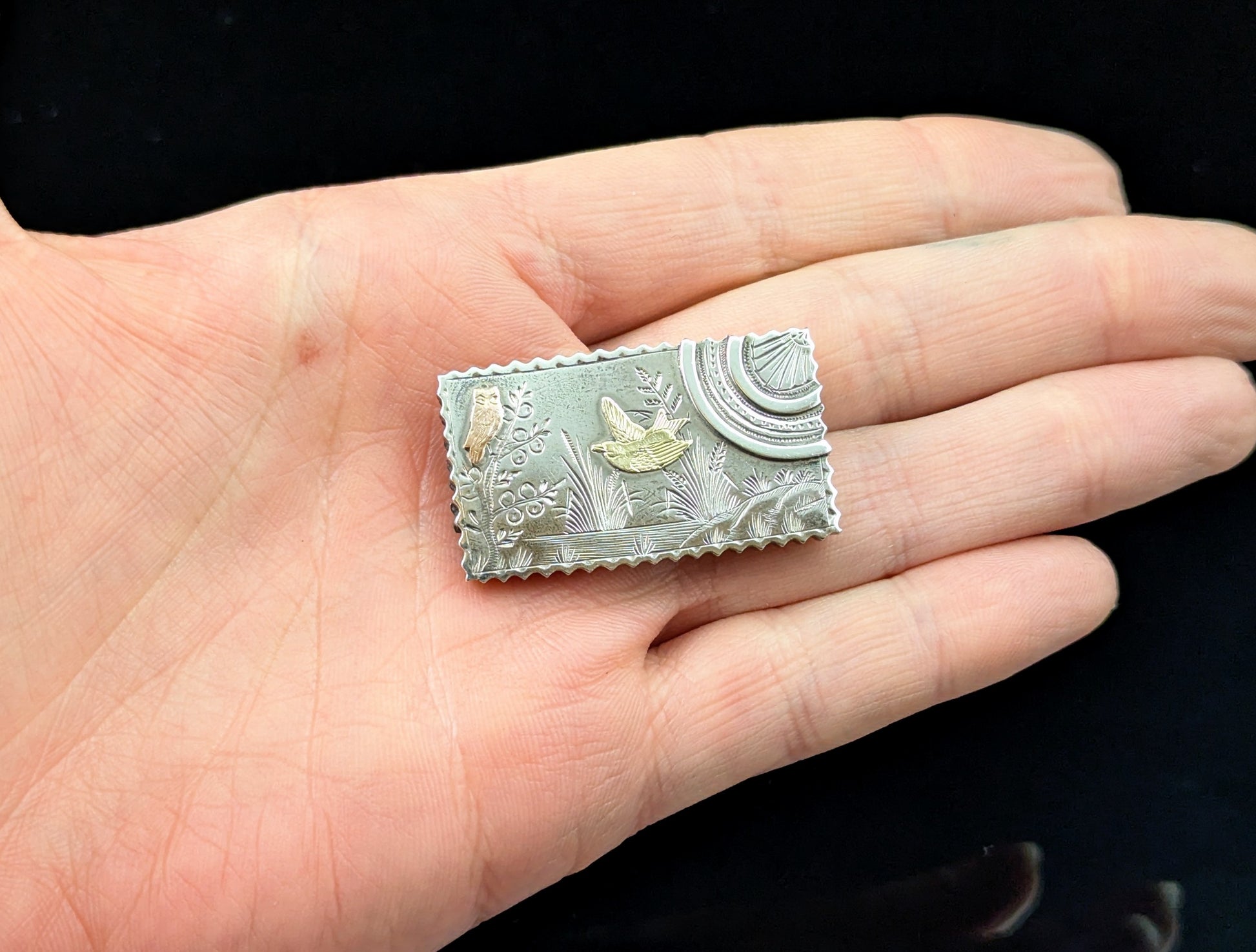 It is a rectangular shape in sterling silver with a applied 9ct yellow gold swallow and a rose gold owl.
