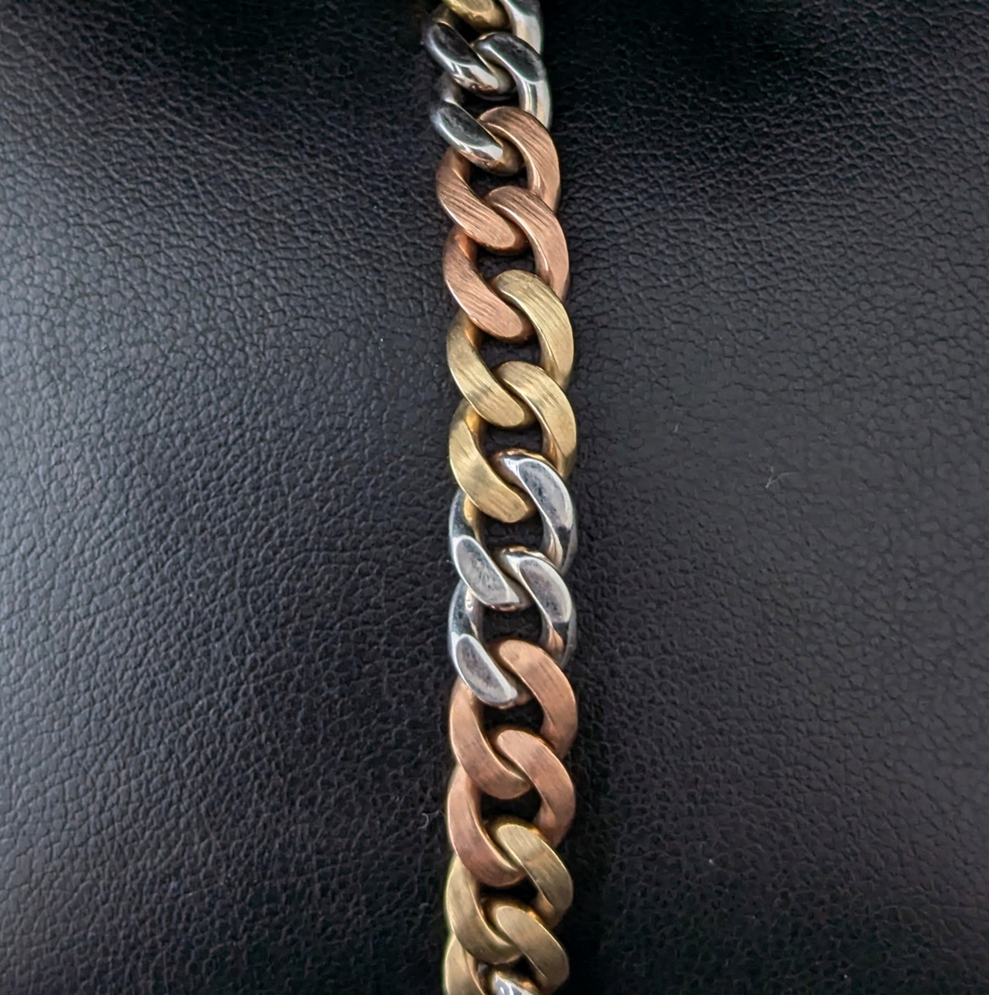 Chunky, rich and buttery 9ct yellow gold, cool white gold and warm rose gold curb links with an edgy, modern squared design, this is a solid gold bracelet, the links are solid and it has a great feel when worn.