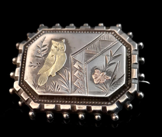 Victorian aesthetic silver brooch, gold owl and butterfly