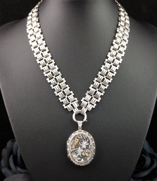 Victorian aesthetic locket, silver and 9ct gold, Kingfisher, Swallow and Dragonfly