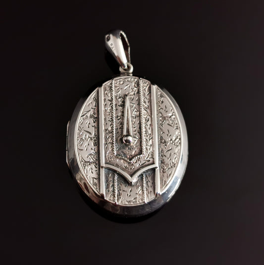 Victorian silver buckle locket, large, engraved