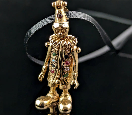 Vintage 9ct gold Clown pendant, multi gemstone, Articulated