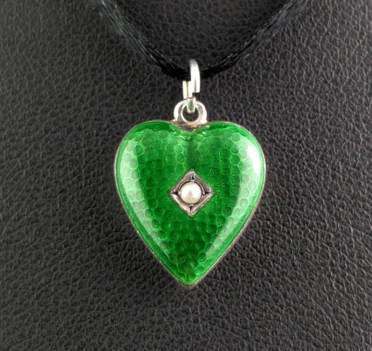 Vintage Art Deco silver and green enamel heart pendant, Seed pearl