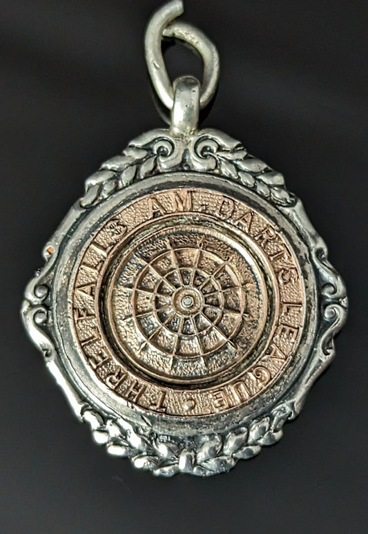 Vintage Art Deco silver and rose gold watch fob pendant, Darts league