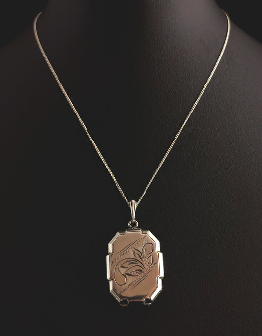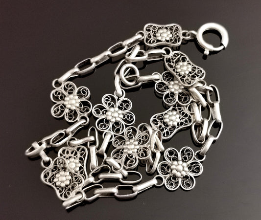 Vintage Art Deco silver Filigree floral and belcher link chain necklace