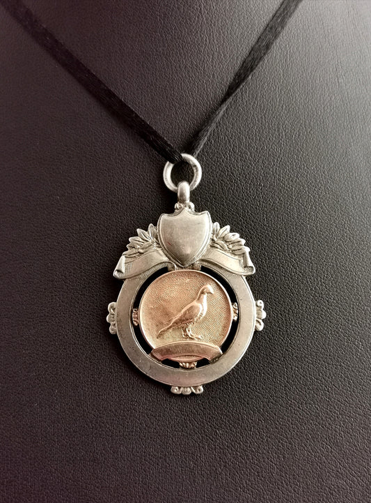 Vintage Art Deco silver and Rose gold fob pendant, Pigeon