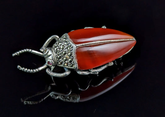 Vintage Carnelian and Marcasite beetle brooch, sterling silver
