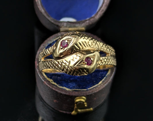Vintage double snake ring, 9ct gold, ruby, Victorian style