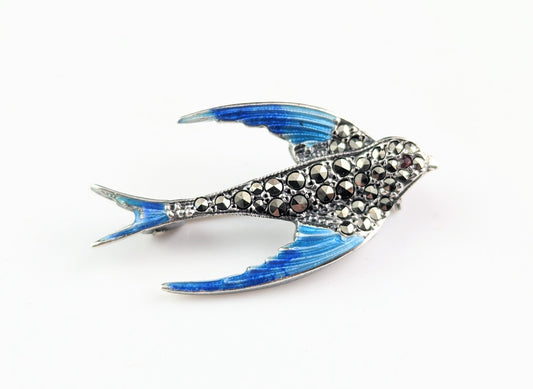 Vintage Marcasite and enamel swallow brooch, 800 silver