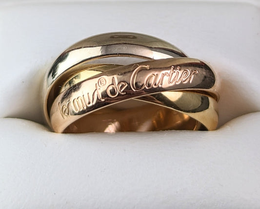 Vintage Les Must de Cartier Trinity band ring, tri colour 18ct gold, boxed