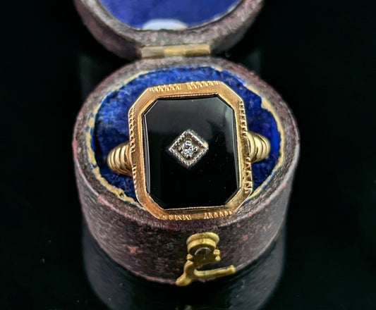 Vintage Onyx and Diamond signet ring, 14ct yellow gold