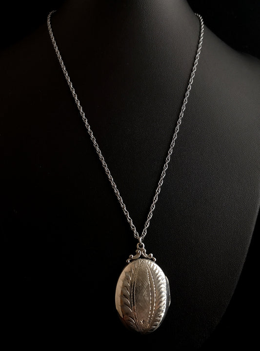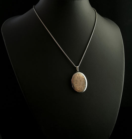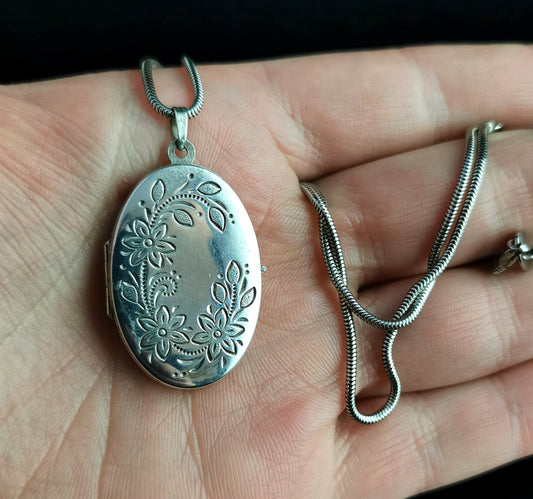 Vintage sterling silver locket necklace, 1970s, floral engraved