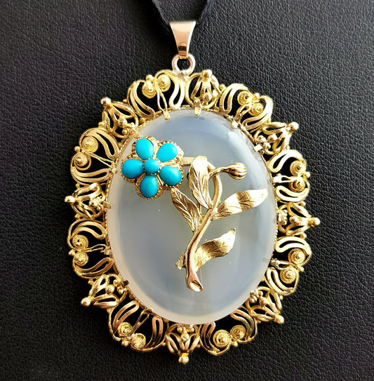 Antique Victorian Chalcedony and Turquoise Flower pendant, 18ct yellow gold