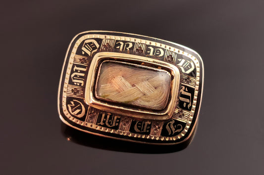 Antique Banded agate mourning brooch, 9ct gold, hairwork, Black and White enamel, Victorian
