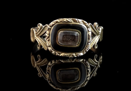 Antique Georgian hairwork mourning ring, 12ct gold, black enamel
